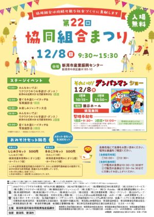 令和6年12月8日(日)9:30~15:30 新潟市産業振興センターにて、新潟県協同組合間提携推進協議会主催「第22回協同組合まつり」を開催いたします。 私たち新潟県漁業協同組合連合会も、新潟漁業協同組合、魚食普及の会と共に出展いたします。